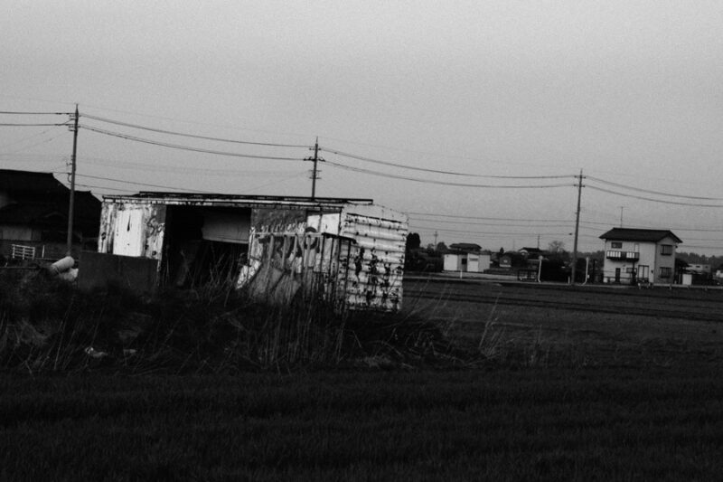 小雨の春、田植え前の射水平野を抜けていくと、田んぼの中にペイントされた廃貨車が見えた。